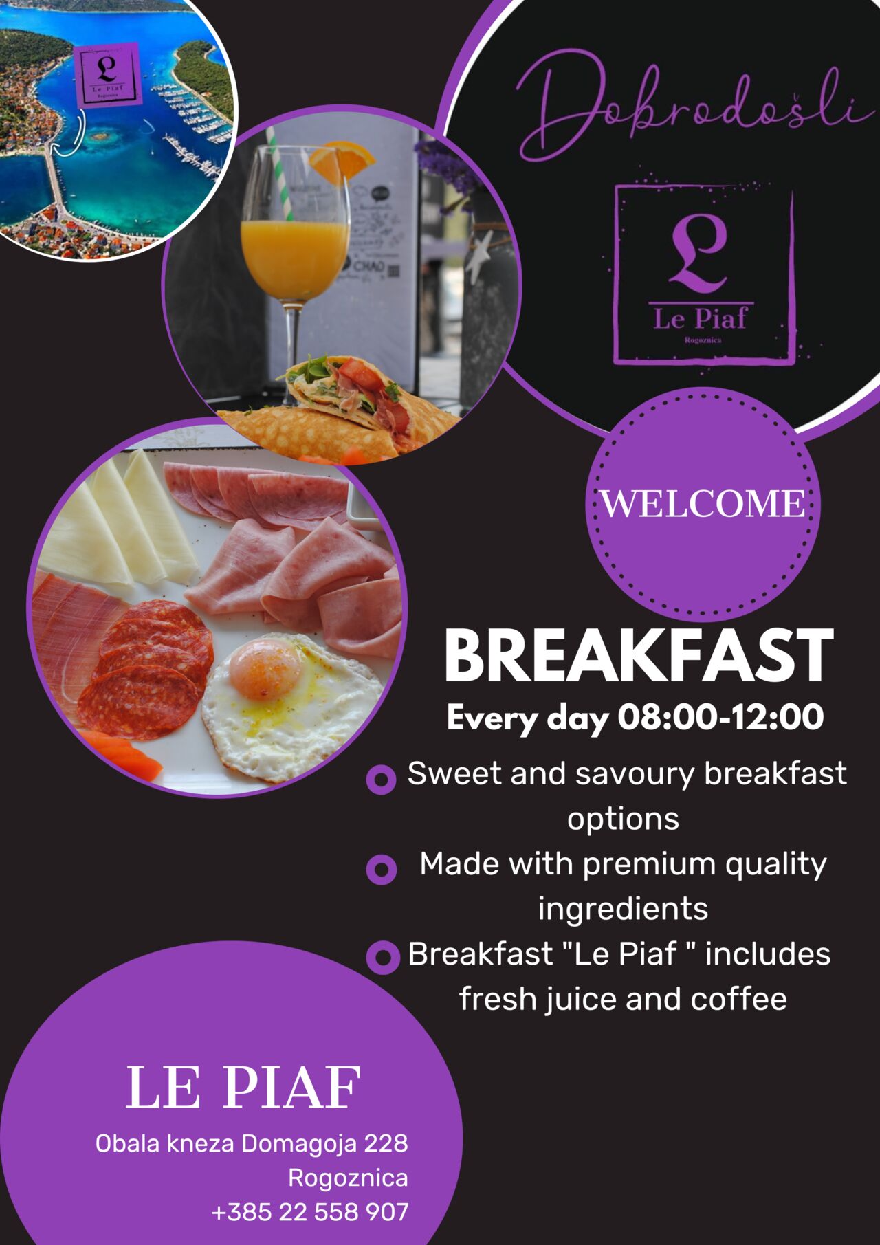 Putovanja su ukras životu, a putovanja pamtimo po ljudima koje smo na njima sreli, po prirodi koju smo ponijeli na razglednicama i suvenirima, po mirisima koje smo zauvijek zapamtili i po okusima koji su nam trenutke učinili posebnim i sretnim. Hvala što ste izabrali našu kuću da piše stranice vašeg putovanja. Učinit ćemo sve da budemo ljudi koji su oplemenili vaše putovanje, da mirisi i okusi koje iskusite ovdje budu vječno pamtljivi, nikad izbrisivi i da vas uvijek podsjećaju na lijepo. Želimo biti vaš gastronomski suvenir, želimo zagrliti vaše potrebe i očekivanja... Da bismo postali vaš suvenir okusa i mirisa treba nam još samo jedno, vaše strpljenje... Motivaciju, znanje i želju već posjedujemo. U nadi da ćemo spojiti vaše strpljenje i našu motivaciju da vam priuštitimo samo najbolje srdačno vam se zahvaljujemo... Osoblje Le Piaf... #LePiaf
